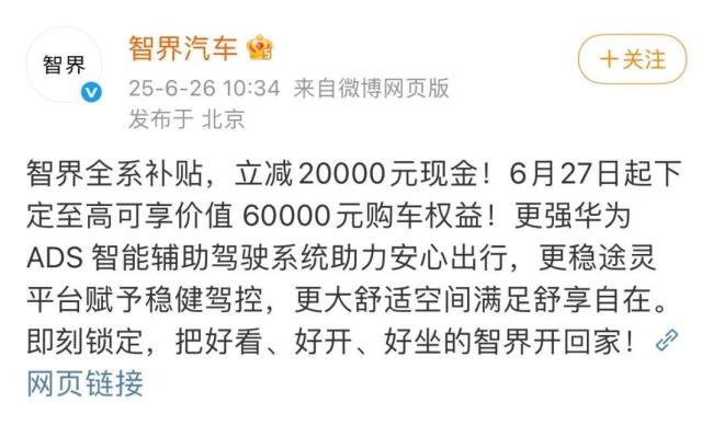 在小米YU7正式上市前,智界紧急降价。6月26日上午,智界针对全系车型提供现金补贴2万元,下定至高可享受价值6万元的购车权益(含置换补贴、金融贴息、选装优惠等)。活动从6月27日至7月31日。