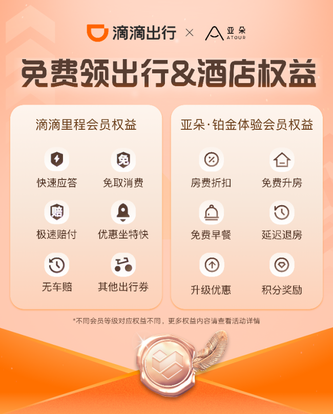 滴滴出行与亚朵集团打通会员权益体系,意味着双方以会员为锚点,实现住宿与出行两大生活场景的衔接与延伸,是打造全场景会员服务生态的一次重要探索。本次合作中,滴滴开放多个备受青睐的打车权益,支持亚朵会员免费领取对应等级的权益,享受出行好服务。