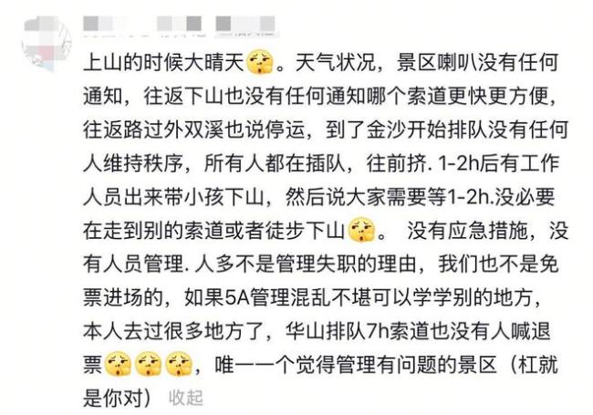 该游客还提到,自己等了5个小时景区才发放雨衣,那时已经淋完雨了。他是最后一批下山的游客之一,到山下已是晚上8点30分左右。他认为,尽管人多,但作为5A级景区,管理服务和应对措施都是不合格的,一张门票要245元。