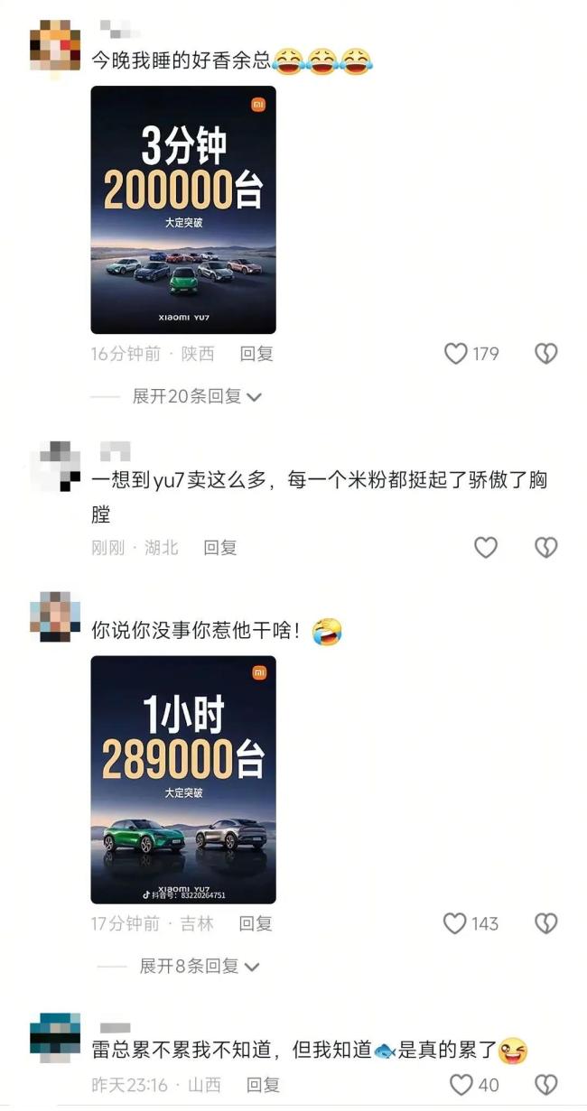 小米YU7上市3分钟订单破20万台,1小时达28.9万台、18小时锁单24万台。YU7上市后的成绩远超去年SU7同期表现,这也让米粉再一次挺起了“骄傲的胸膛”。除了真金白银地支持小米外,部分米粉还涌入华为常务董事、终端业务群(BG)董事长余承东社交媒体评论区,晒出YU7的订单海报。