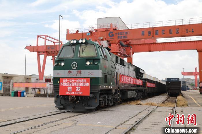 中新社广西贵港7月2日电 (李红志)7月2日,载着石粉等货物的32108次货物列车从广西贵港站驶向钦州港东站,到港后将换乘海运班轮发往越南海防。这是广西开出的首趟多式联运物流总包外贸货物列车,标志着“贵港—钦州—海防”多式联运新模式正式启运。