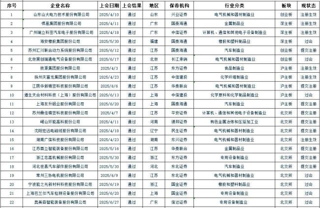 从上市进程看,过会企业中已有6家成功注册生效,9家已提交注册,整体推进节奏稳健。