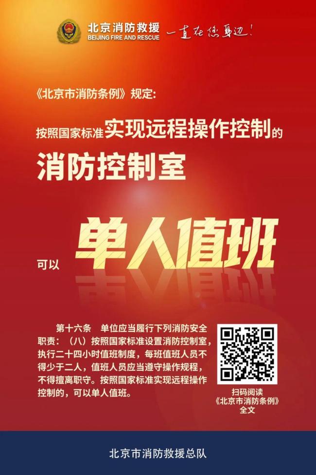 《北京市消防条例》规定,单位应当履行下列消防安全职责:按照国家标准设置消防控制室,执行二十四小时值班制度,每班值班人员不得少于二人,值班人员应当遵守操作规程,不得擅离职守。按照国家标准实现远程操作控制的,可以单人值班。对于单位消防控制室的值班人员有擅离职守等违反国家和本市消防控制室操作规程行为,或者单位未对本单位消防设备操作控制人员、专职和兼职防火人员等重点岗位的人员进行专项培训的,责令改正,可以处五百元以上五千元以下罚款。