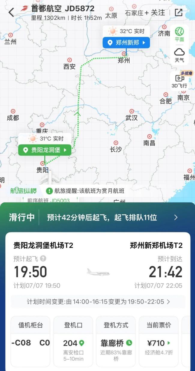 据查询,原计划当天14:00从贵阳龙洞堡机场起飞、16:10到达郑州新郑机场的JD5872航班,现变更为19:50起飞,预计22:00左右到达郑州。