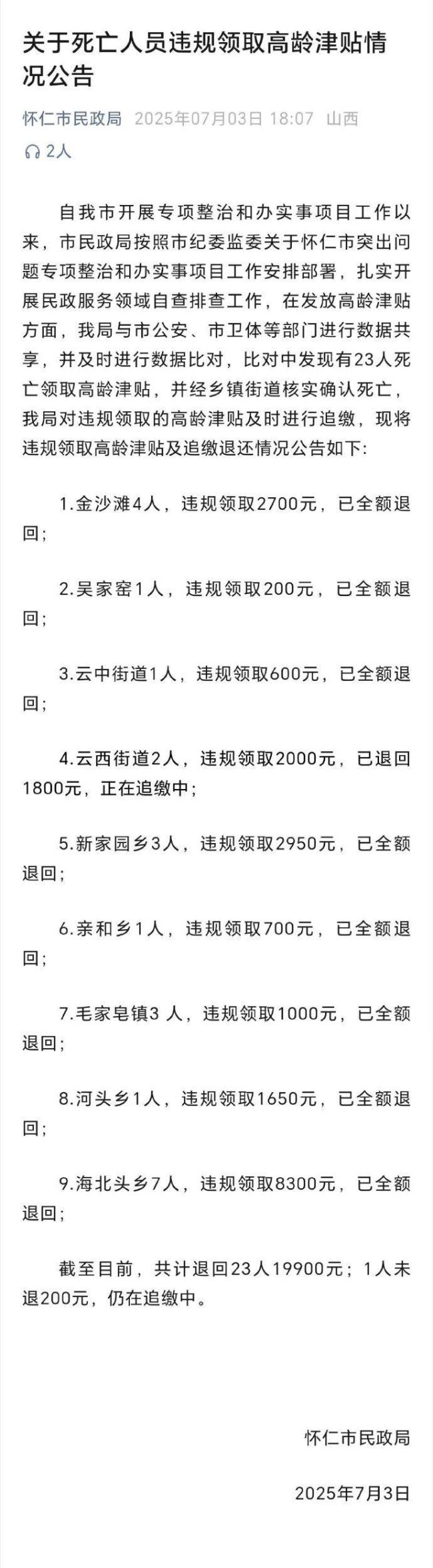 23名死亡人员领津贴已全部追回 涉事责任人被问责!近日,山西省朔州市怀仁市发生了一起关于“23名死亡人员领高龄津贴”的事件,引起了广泛关注。怀仁市纪委监委正在对相关责任人进行问责,市民政局已经追回了全部超期领取的高龄津贴20100元。