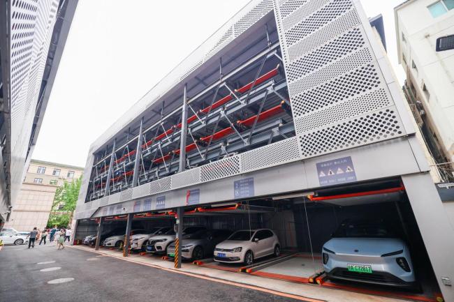西城区银岛商务楼立体停车设施改造后可提供104个车位,包括普通、无障碍和SUV等多种类型车位。白天为周边办公区域提供停车资源,夜晚则供附近居民使用。