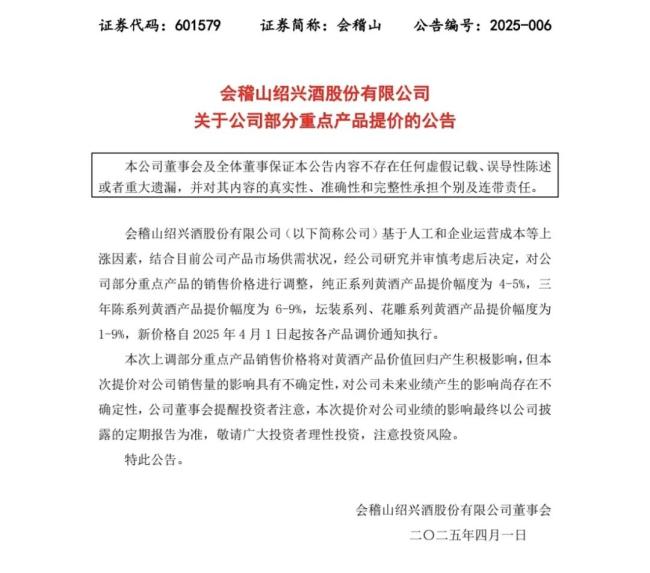 3月31日,会稽山发布调价公告,宣布对纯正、三年陈、坛装及花雕等系列产品实施1-9%的价格调整。