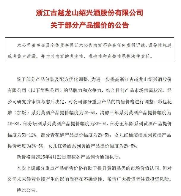 紧随其后,4月1日,古越龙山发布公告称,对旗下包括彩包花雕(加饭)系列、女儿红系列等黄酒产品进行提价,提价幅度最高可达12%。