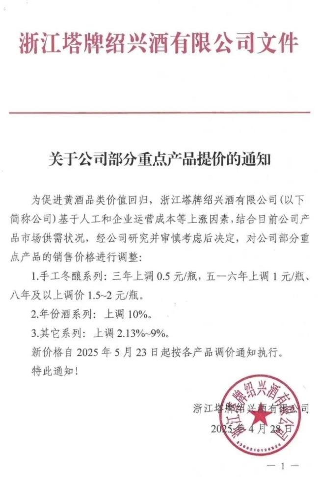 5月23日,浙江塔牌绍兴酒有限公司将对手工冬酿系列中,三年、五年、六年、八年及其他系列产品进行提价,上调幅度在2.13%-9%。