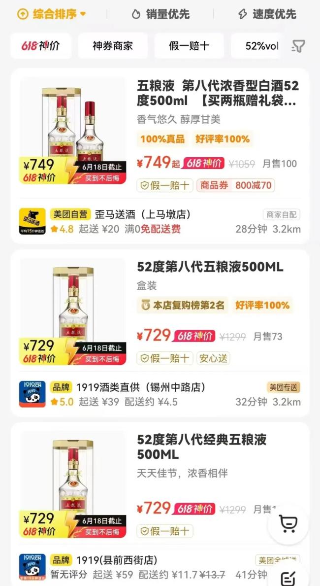 即时零售的引流大促带来的是白酒价格体系的“破防”。618期间,五粮液、剑南春、汾酒等名优白酒价格直接被补到五年以来最低价。