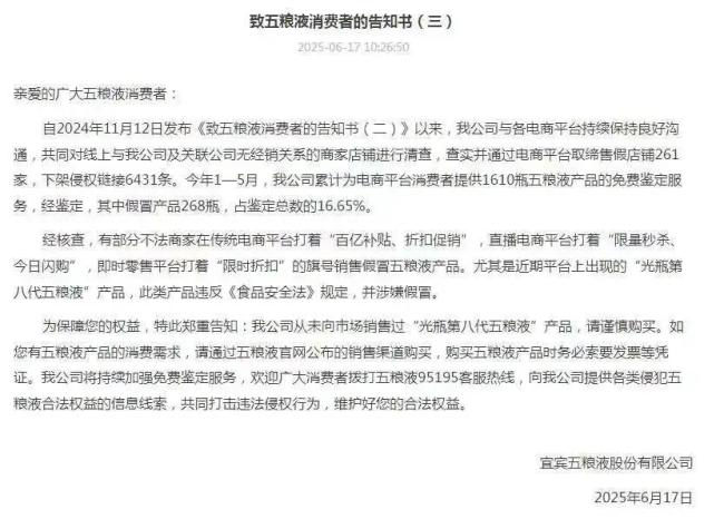 五粮液更是在6月17日发布的《致五粮液消费者的告知书(三)》,表示有部分不法商家在即时零售平台打着“限时折扣”的旗号,销售假冒五粮液产品。