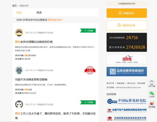 记者在黑猫投诉平台以“携程调价助手”为关键词检索发现,共有110条投诉结果,其中多条投诉提到,“调价助手”存在未经商家同意开通、并在商家要求关闭后又反复开关的情况。