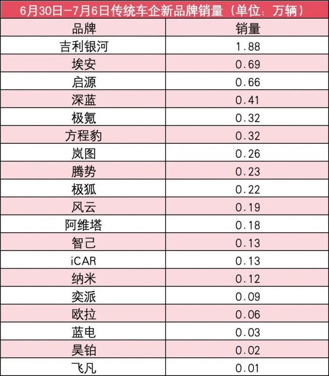 其余品牌则均在0.2万辆以下,包括风云为0.19万辆;阿维塔为0.18万辆;智己为0.13万辆;iCAR为0.13万辆;纳米为0.12万辆;奕派位0.09万辆;欧拉为0.06万辆;蓝电位0.03万辆;昊铂为0.03万辆;飞凡为0.01万辆。