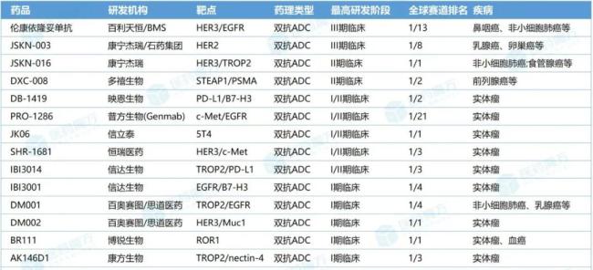 在这样的发展趋势之下,除了百利天恒,还有不少国内药企在双抗ADC赛道提前布局,并处于全球领先地位,如康宁杰瑞、多禧生物等。据医药魔方数据库,国内已有14款全球首创的双抗ADC进入临床阶段,其中4款已推进至II期或III期关键研究,包括康宁杰瑞的HER2双抗ADC等。