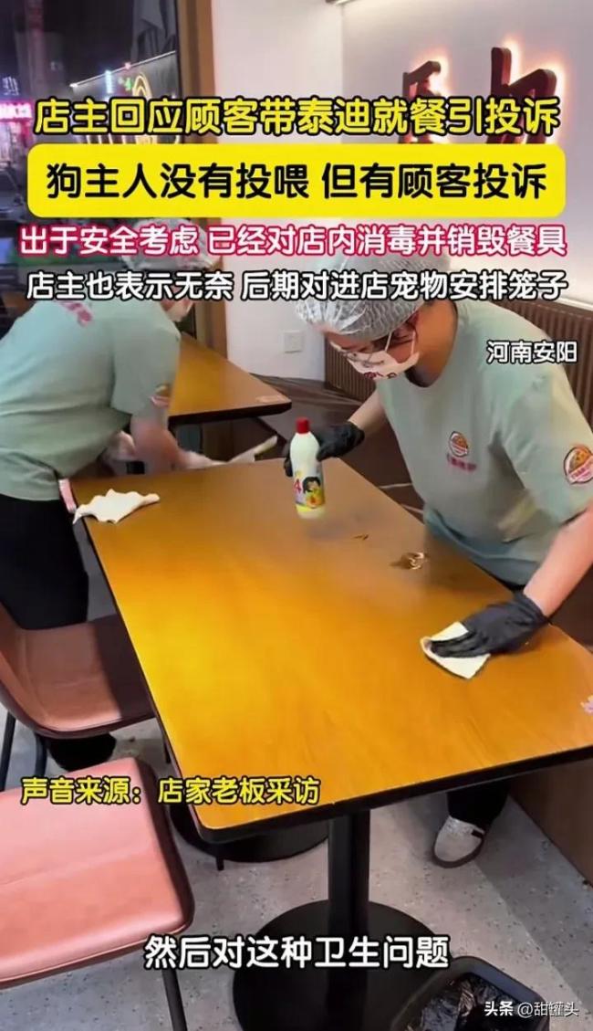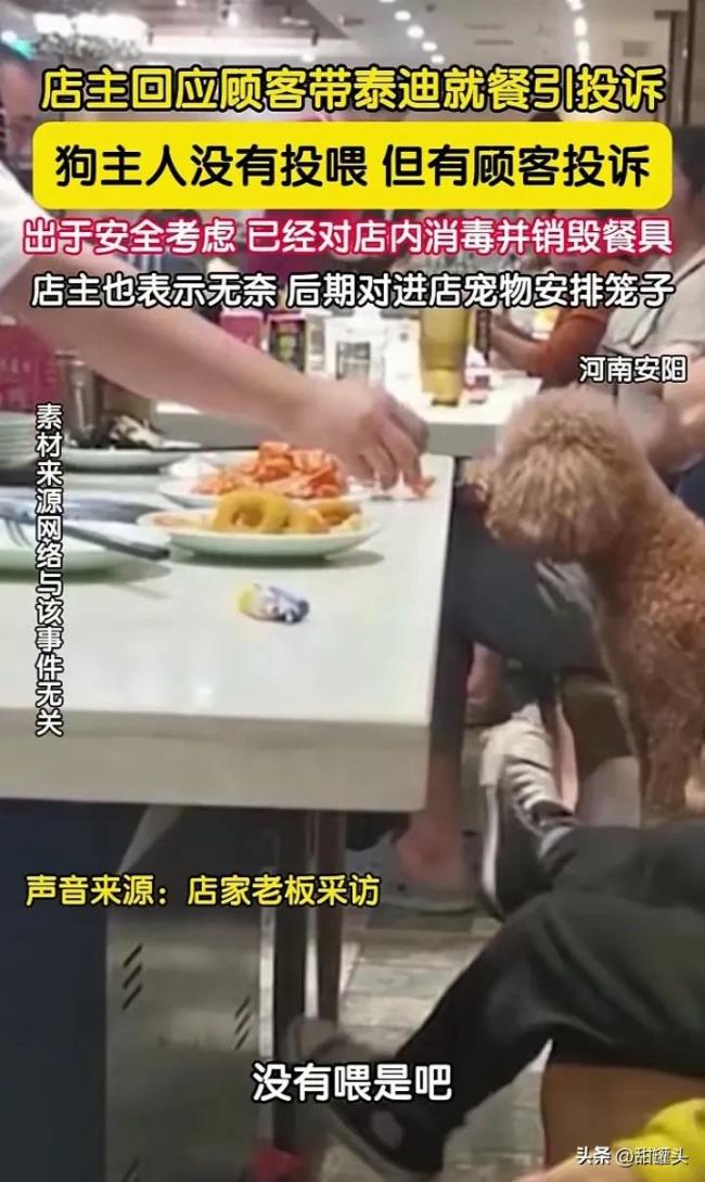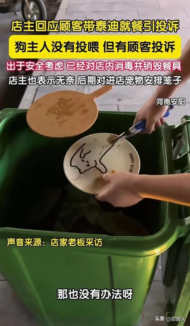 泰迪进餐厅污染餐具引投诉店家回应。河南安阳一餐厅,因为一顾客带泰迪犬上桌吃饭,引起其他顾客不满并投诉。店老板没办法直接把店里消毒了遍,并把餐具全部销毁了。城市养狗规定明确出门遛狗必须栓绳戴嘴套,但是这些狗主人基本上没人遵守,如果说在小区内遛狗不栓狗绳也就罢了,很多狗主人直接把狗带进了餐厅用餐,而且还把狗放到了餐桌上面。