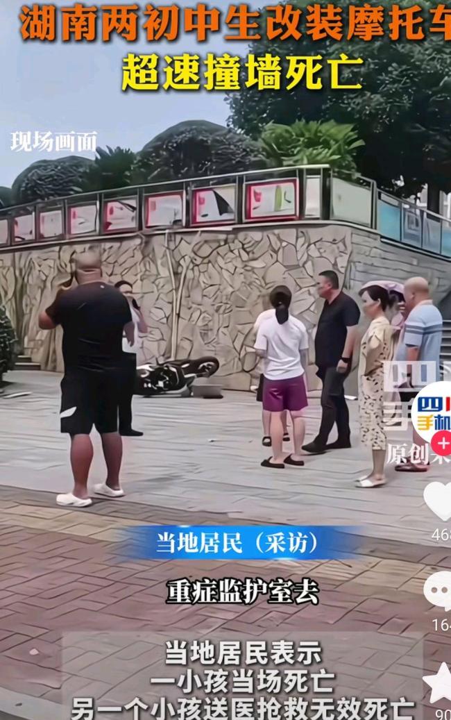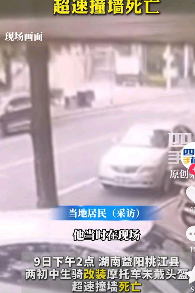 两初中生骑改装摩托车超速撞墙身亡 鬼火少年悲剧警示!7月9日下午,湖南益阳两名初中生骑着改装的摩托车在街上飞奔,未戴头盔。视频显示,他们的摩托车失控撞向前面的墙,两人头部和身体都遭受重创。
