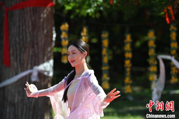 图为7月13日,工作人员在“簪花之路”途经的“三生三世”景区表演节目。九美旦增 摄