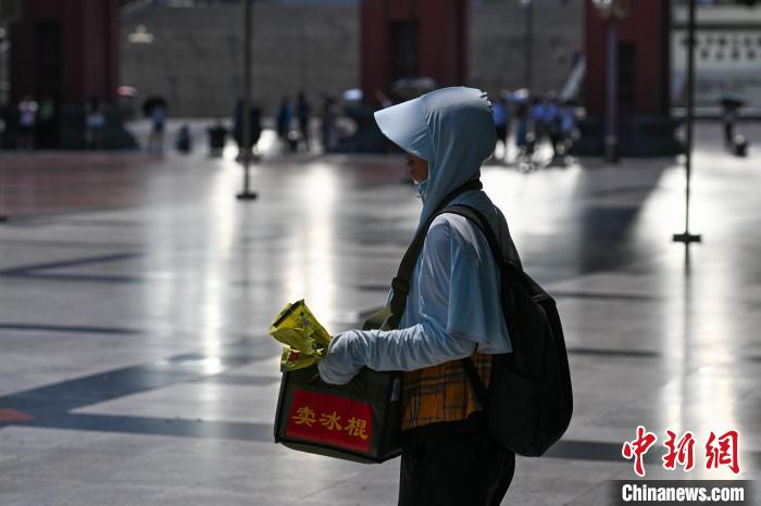 7月15日,重庆人民广场,一商贩冒着高温天气售卖冰棍。中新社记者 何蓬磊 摄
