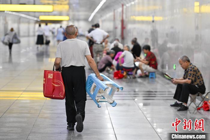 7月15日,一位市民带着凳子来到重庆轨道交通曾家岩站纳凉。中新社记者 何蓬磊 摄