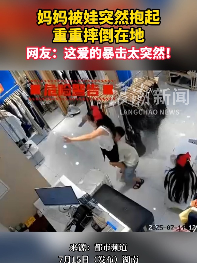 7月15日,湖南发生了一起令人意外的事件。画面中,一个小男孩突然从身后紧紧抱起妈妈,这一突如其来的举动让妈妈瞬间重心不稳,身体猛烈地撞上了旁边的筐子,随后重重摔倒在地。