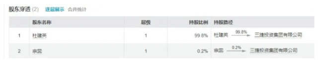 离开娃哈哈后,杜建英于2011年创办三捷投资集团,开始涉足生物医疗、新能源、新材料、教育等产业投资。股权结构显示,该公司有两位股东,其中杜建英持股99.8%,毫无疑问是企业的实际控制人。有意思的是,还出现了一位名叫“宗蕊”的股东。而公开资料表明,宗蕊正是宗庆后幼年送养的亲妹妹。
