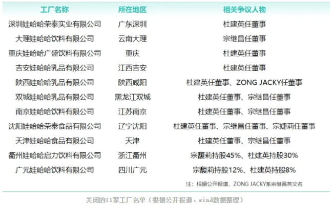 《和讯商业》根据公开资料整理发现,目前可以确认关停的11家工厂,均与杜建英有关联。其中,宗继昌担任大理、双城、南京、沈阳、天津等多家分厂公司的董事,宗婕莉则出任沈阳娃哈哈荣泰食品有限公司董事。