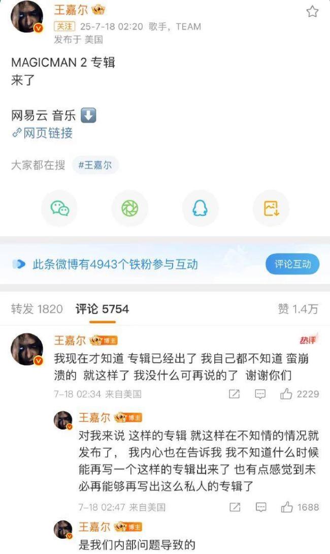 7月18日凌晨,歌手王嘉尔的新专辑《MAGICMAN 2》提前泄露上线,而原定的发布时间是当天中午12点。这一突发状况让王嘉尔感到非常意外和困扰。他在凌晨2:34左右通过个人微博发文表示自己刚刚得知专辑已经发布,他对此毫不知情,感到非常崩溃。他还补充说,这是由于内部问题导致的。