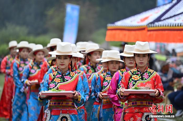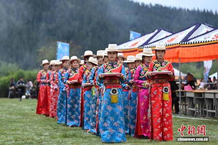 图为身穿“三格毛”的藏族姑娘为长寿老人端“藏王宴”菜品。中新社记者 九美旦增 摄
