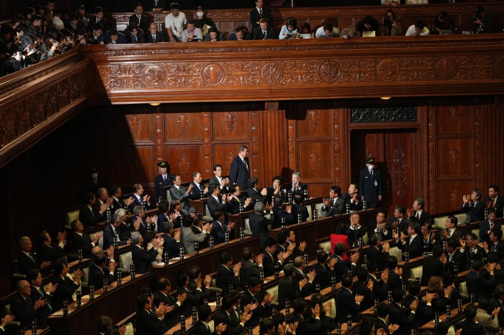 2024年10月1日,在位于日本东京的日本国会众议院举行的首相指名选举中,石破茂起身致谢。 新华社记者张笑宇摄