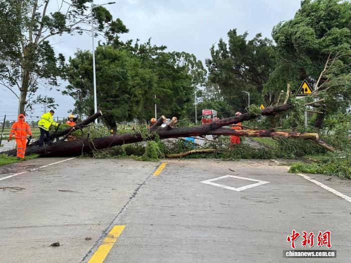 20日,被台风吹倒的大树横卧在台山一道路中间。中新网记者 王坚 摄