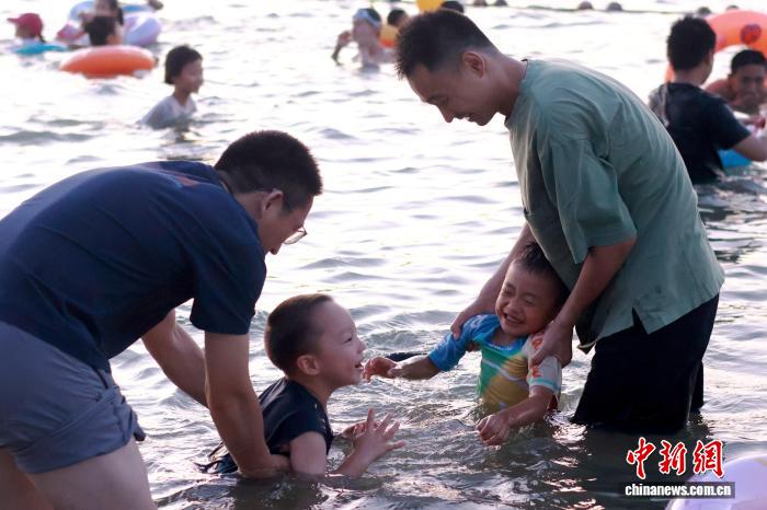 7月20日,一对父子在安徽合肥天鹅湖畔嬉水。连日来,合肥持续高温。每到傍晚,天鹅湖沙滩、安全水域成为当地市民纳凉避暑的首选。张强 摄