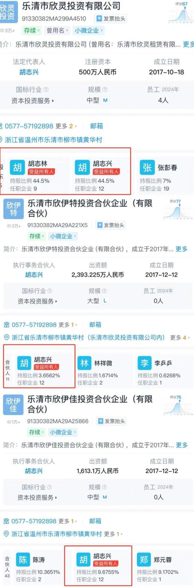 天眼查显示,股东当中的乐清市欣灵投资有限公司、乐清市欣伊特投资合伙企业(有限合伙)、乐清市欣伊佳投资合伙企业(有限合伙)的控股及执行事务合伙人中也均出现了兄弟二人的身影。