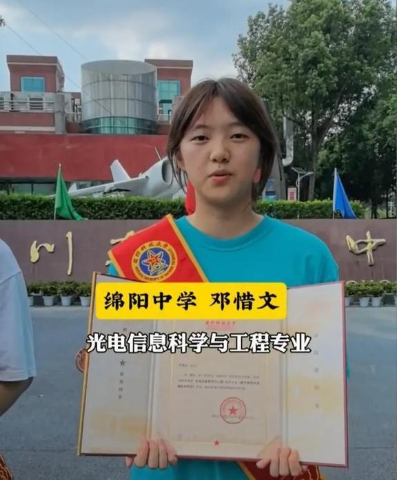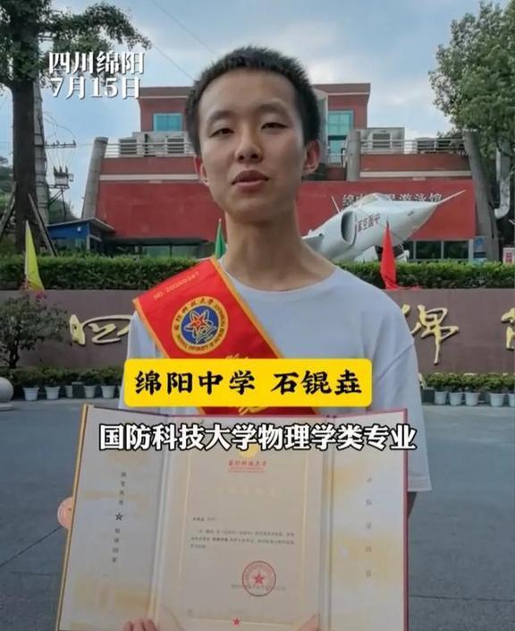 两人站在母校绵阳中学的游泳馆前,身后是熟悉的校徽标志和彩旗飘扬,旁边还有一架显眼的飞机模型,仿佛在为他们加油,祝贺他们勇敢追梦,实现国防理想。石锟垚报的是国防科大的物理学类,可能涉及核技术研究;邓惜文则选择了光电信息专业,可能与激光武器相关。这些专业都是顶尖领域,能脱颖而出实属不易。