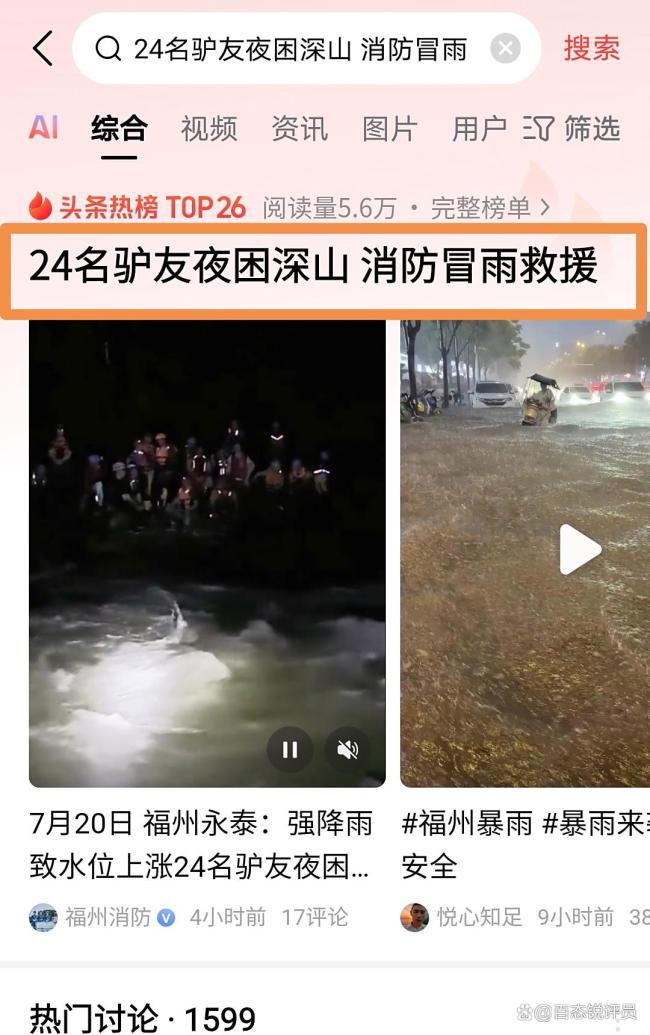 7月20日21时16分,福州永泰县突发暴雨,24名驴友因河水上涨且对地形不熟,被困于嵩口镇大喜溪九龙潭附近。接到报警后,当地消防救援部门迅速响应,联合民警、护林员以及民间救援队全力展开救援行动。