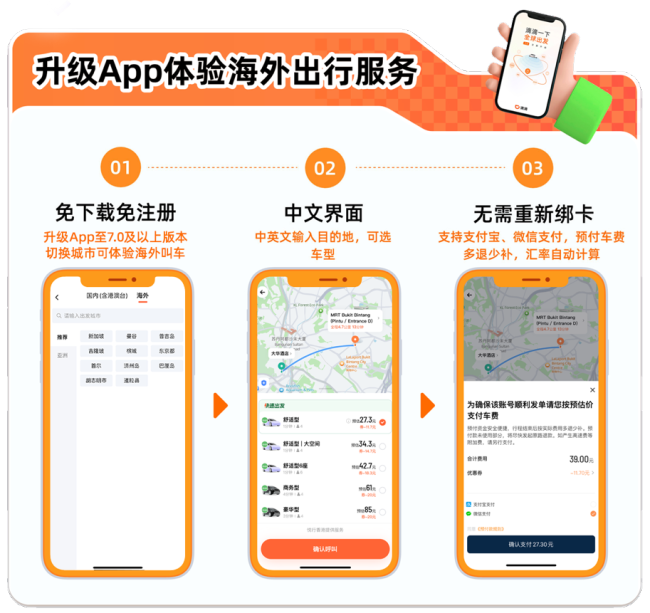 自滴滴海外出行上线以来,已持续在春节、五一、端午等多个假期为用户跨境出游提供便捷、实惠的出行服务。在使用上也非常便捷,用户无需额外下载或注册其它打车软件,将滴滴App升级至最新版,点击左上角切换城市,选择海外城市;或在海外出行开通服务城市自动定位,即可体验丝滑的打车服务。海外出行还支持用中英文输入起、终点;支持使用支付宝、微信预付车费,汇率自动计算;用户可在App内用中文和司机即时沟通,支持中文客服,让用户不再为语言障碍感到发愁。