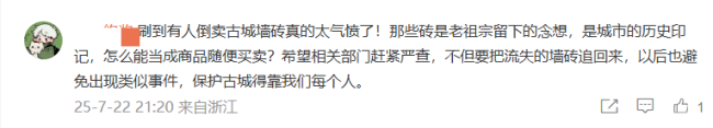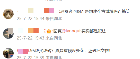 不少网友谴责这一售卖行为荒唐无知,认为古城墙砖是历史见证,不该被当成普通商品在线叫卖,直言“每块砖都带着历史印记,倒卖就是在破坏文物”。另外,对于超过百人的购买记录,有网友质疑,明知是老城墙砖还回购,是否助长文物倒卖风气?若商家售卖行为被认定非法,购买者是否也应当被追责?