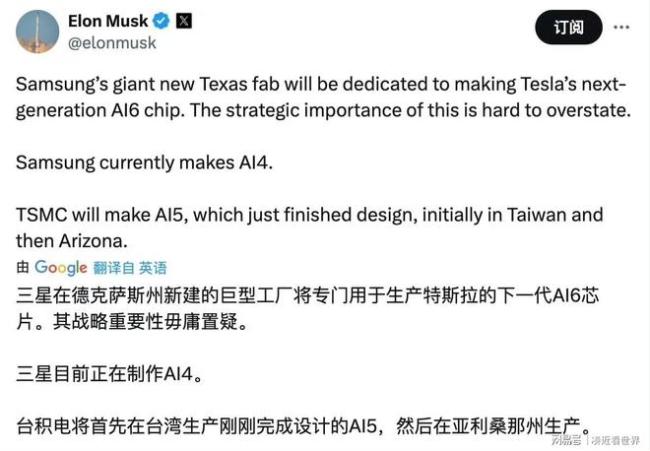 结语:德州的“芯片革命”,能否改写历史?特斯拉与三星的 165 亿美元交易,不仅是一家车企的技术选择,更是美国重塑半导体霸权的关键一步。尽管特斯拉销量下滑的阴影仍在,但 AI6 芯片的战略价值,或许能让马斯克再次创造 “不可能”。正如他所言:“我们正在做的,是改变人类未来的事情。”有外媒网友热情地对此评价:当三星德州工厂的第一批 AI6 芯片下线时,或许我们会看到:那个曾经依赖亚洲制造的美国,正在马斯克的带领下,重新定义全球芯片的未来。而这场革命的起点,正是德州泰勒小镇的那座超级工厂 —— 那里闪烁的,不仅是芯片的光芒,更是一个国家对技术主权的渴望。当然,前提是马斯克的商业帝国不能跨……