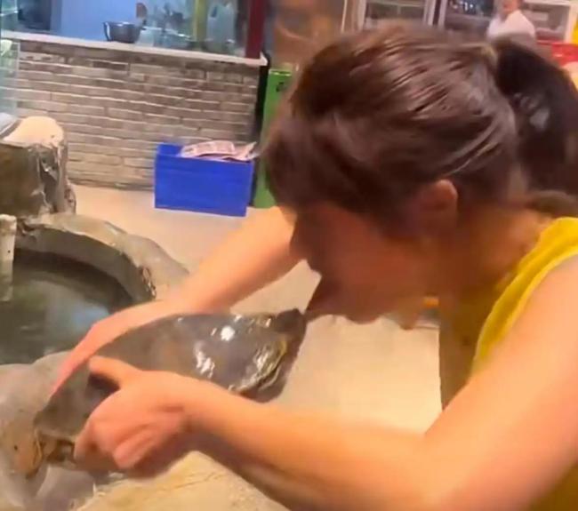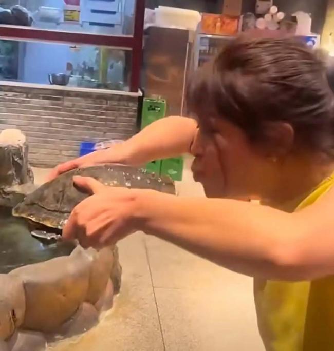 女子在饭店挑逗甲鱼被咬伤嘴唇 被咬后很生气查询后没有去打针