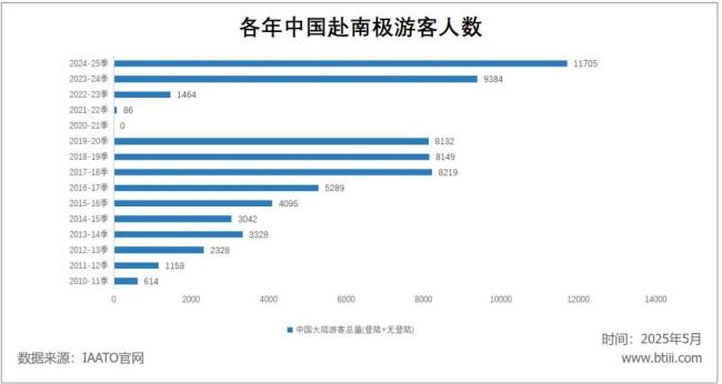 2024-2025年,赴南极旅游的中国游客数量达到11705人次,占当年前往南极全球游客数量10%,位居世界第二。