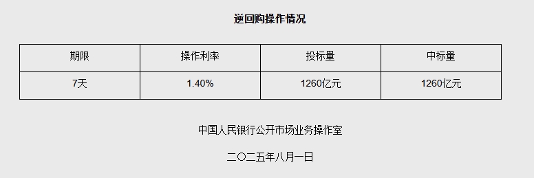 中新网8月1日电 据央行网站消息,2025年8月1日中国人民银行以固定利率、数量招标方式开展了1260亿元逆回购操作。具体情况如下:
