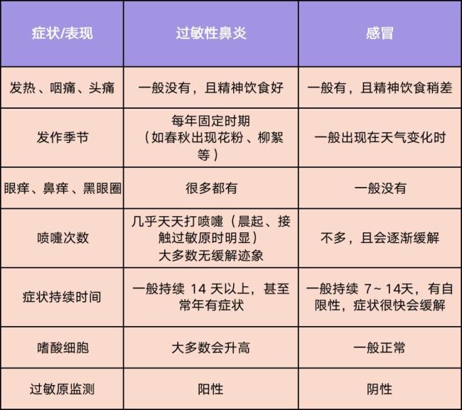 为了帮助家长们初步判断,可以参考以下表格中列出的两者的区别。如果孩子正遭受鼻塞、流涕、打喷嚏的困扰,且家长难以辨别是感冒还是过敏性鼻炎,建议尽快就医,由医生进行评估和诊断,以便对症处理。