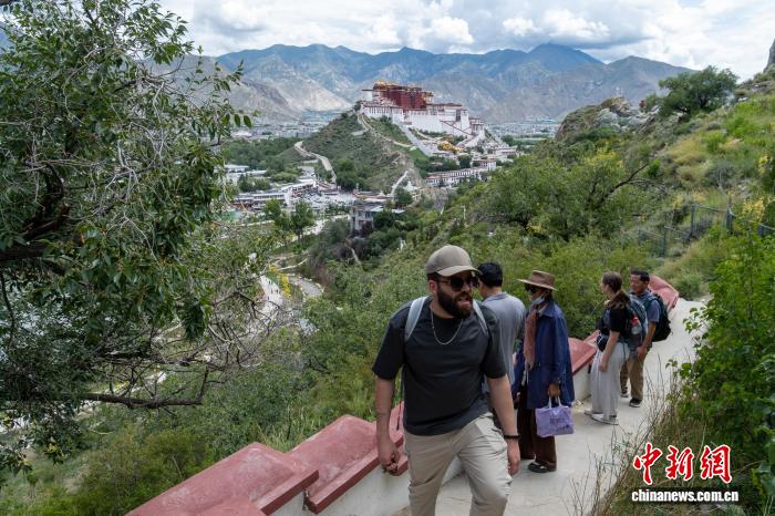 8月4日,外籍游客登上拉萨团结公园药王山步道。中新社记者 江飞波 摄