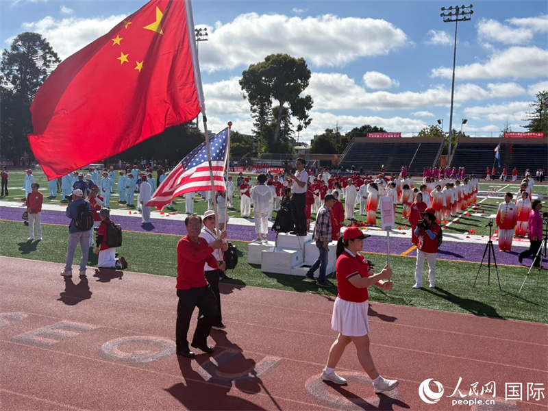 人民网红木城8月3日电 (记者邓圩)近百支队伍高举队旗、精神抖擞地步入会场;250位太极爱好者表演太极拳与太极扇,展现中华武术之美;241位广场舞爱好者携手演出“最炫民族风”……日前,美国北加州华人文化体育运动大会在旧金山湾区红木城举行开幕式。