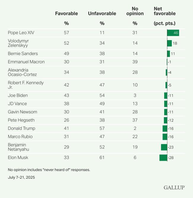 根据盖洛普公司的最新民意调查结果,在14位美国及国际知名人物中,教皇利奥十四世在美国民众中的受欢迎程度最高,而马斯克和内塔尼亚胡排名垫底。教皇利奥十四世获得57%的好感度和11%的反感度,净好感度达到+46%,位列第一。乌克兰总统泽连斯基以52%的好感度和34%的反感度,净好感度+18%排名第二。无党派参议员桑德斯则以49%的支持率和38%的反感率,净好感度+11%排在第三。
