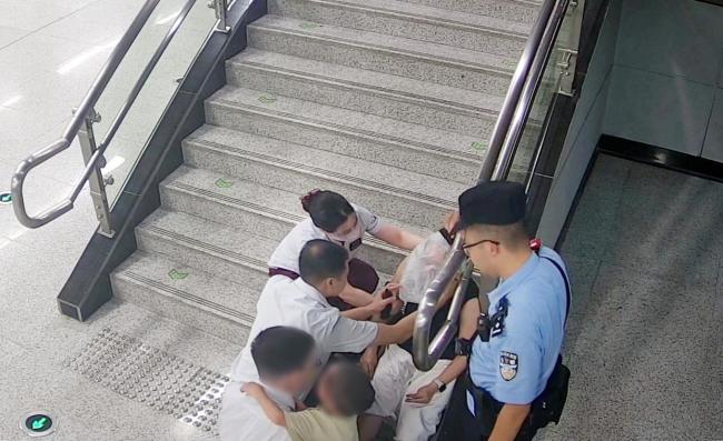 当晚7时许,安检员赵茜发现一名女乘客瘫坐在楼梯上,张莹闻讯上前查看并询问情况。乘客表示自己全身麻木无知觉,并伴有心慌、胸闷、呼吸困难,误以为是中暑,已让家属带着孩子出站买水。张莹观察到乘客双手抽搐,立即报告值班站长刘刚龙。