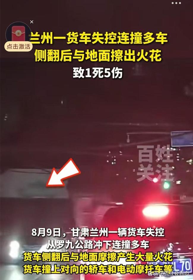 兰州货车失控连撞多车 事故致1死5伤引发热议。8月9日,兰州罗九公路上发生了一场意外。一辆货车在行驶中突然失控,冲下山路,接连撞上多辆车辆,包括对向驶来的轿车和电动摩托车。撞击后,货车侧翻,车身与地面摩擦产生大量火花。事故发生后,交警等相关部门迅速到场,组织力量将伤者送往医院救治,现场处置工作有序展开。