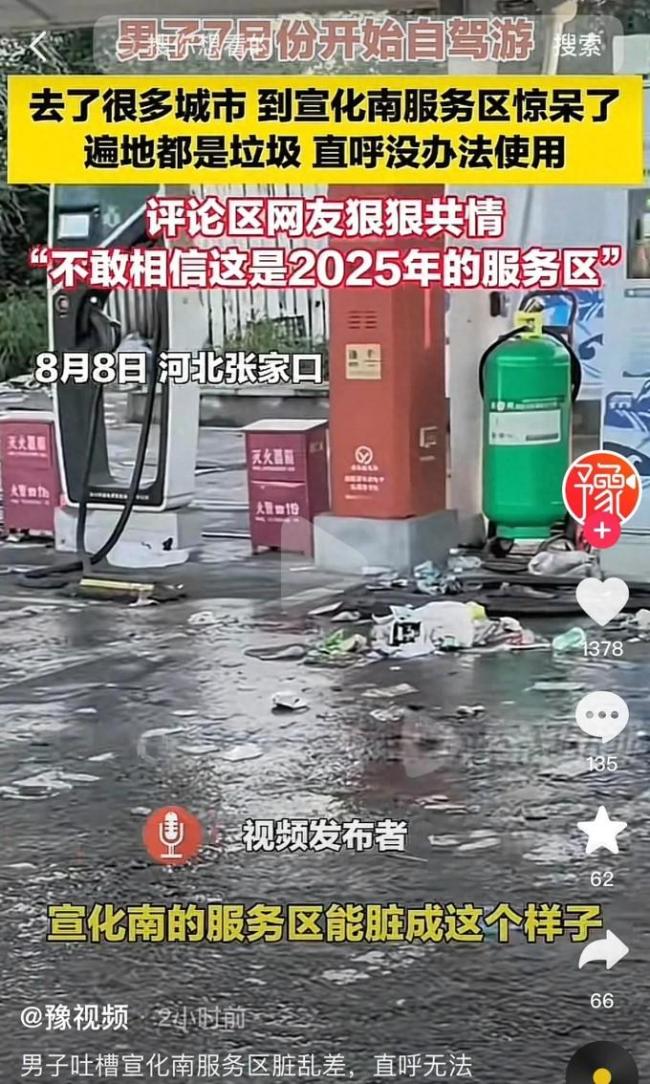 一位网友回忆起自己曾在宣化服务区的经历,称洗手间内有大量粪便,给他留下了深刻的印象。2025年8月,又有网民发布视频显示宣化南服务区垃圾成堆,热水甚至被用来洗手。同年7月,另一段视频展示了方便面桶和其他废物堆积在一起,灰尘已经变黑,长时间未清扫。早在2023年8月,就有网民将宣化南服务区称为全国最脏的服务区。