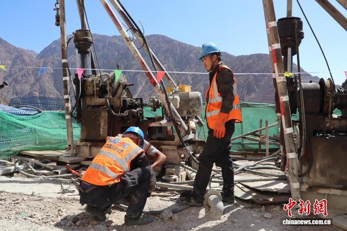 8月9日,新疆大石峡水利枢纽工程建设现场,工人正在大坝右岸1707米海拔处维修灌浆设备。中新社记者 蒋文月 摄