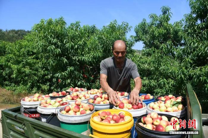 中新网运城8月15日电 (李庭耀 李泱南 杨秀文)夏末秋初,山西运城闻喜县河底镇坡申村水果种植基地,两万余棵果树遍布山岭,鸡心果、珍珠枣油桃等20余种水果挂满枝头。昔日荒岭如今瓜果满枝,一个集标准化种植、休闲采摘、现代储存于一体的水果生产基地,成为激活乡村经济、带动百姓增收的“新引擎”。