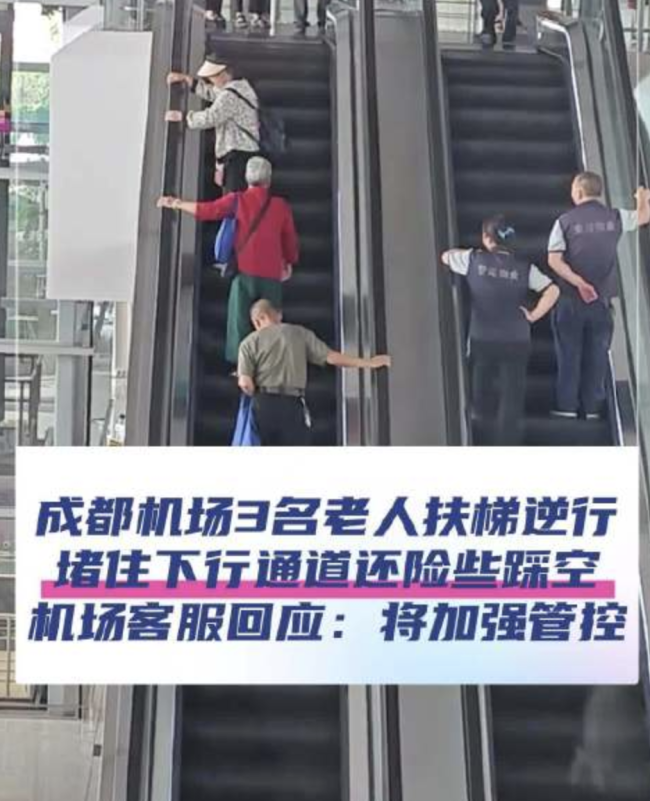 成都机场3名老人扶梯逆行堵住通道,一名红衣老人还险些踩空